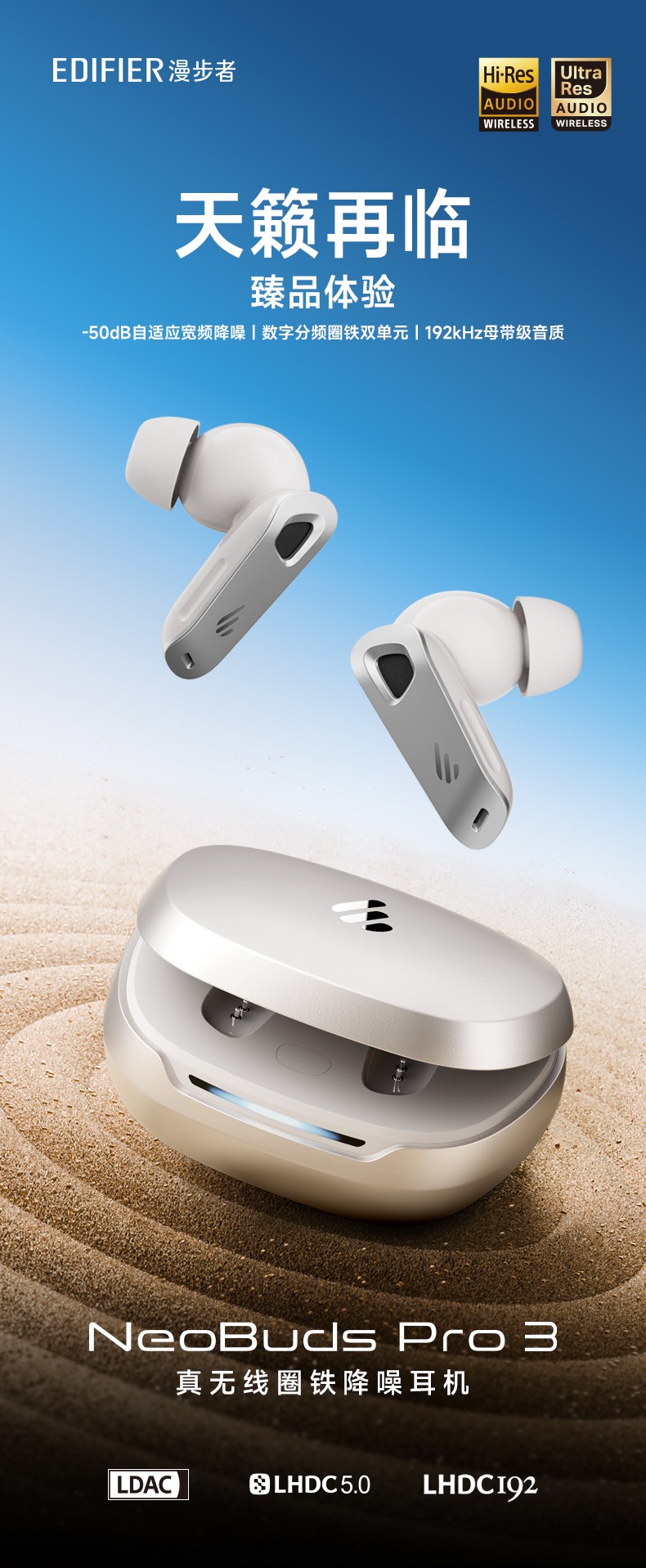 漫步者为Lolli3 ANC搭载了13mm多层复合振膜单元,采用高密闭性独立音腔设计,支持最高96kHz/24bit的采样率。