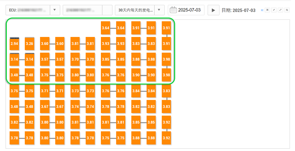 此外,通过运维平台,我们还可以查看每块组件的发电量,如下图所示,每块组件上显示的数字即为当天发电量。我们以被遮挡组件所在的北面屋顶组件为例,即图中绿框所圈部分,该面屋顶发电量共计141.08度。若该系统采用传统组串式逆变器,粗略估算一下,该屋面的组件功率将受到整串中输出最小的一块组件(发电量为2.94度)的限制,那么这一天系统的发电量则为111.72度,比微型逆变器系统少了约29度电,发电损失约20%。
